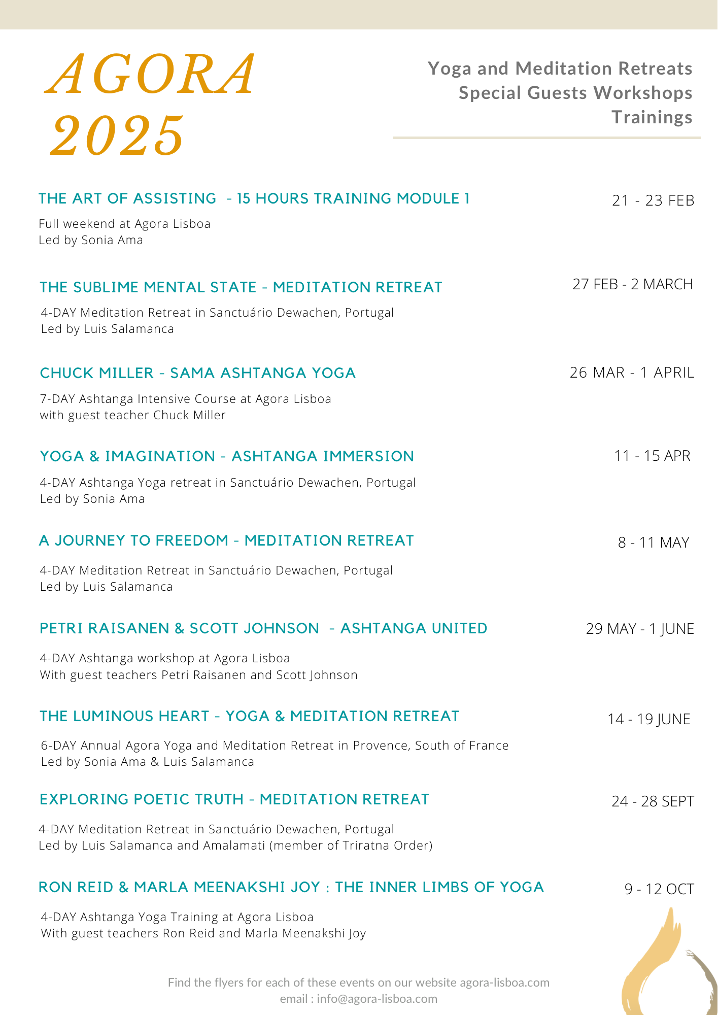 You can also now download Agora programmation 2025 for Yoga and Meditation Retreats, Special Guests Workshops and Trainings by clicking on the button below.